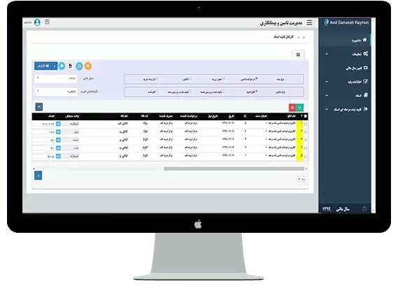 - کارتابل جامع اسناد تأمین برای مشاهده و مدیریت اسناد با وضعیتهای مختلف (قابل تأیید، تأیید شده، بررسی نشده، لغو شده و…)، بررسی وضعیتها، مرتبسازی، لغو و برگشت از لغو اسناد (با/بدون تأیید چند مرحلهای) و مشاهده تاریخچه عملیات.
