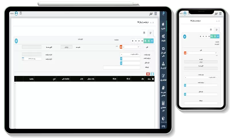 - تنوع در تعریف الگوی درخواست و ارسال کالا (امانی، تولید، خرید، داراییثابت، سایر، ضایعات، فروش، مصرف و پیمانکاری) با 3 وضعیت موجودی و 2 ماهیت سند.